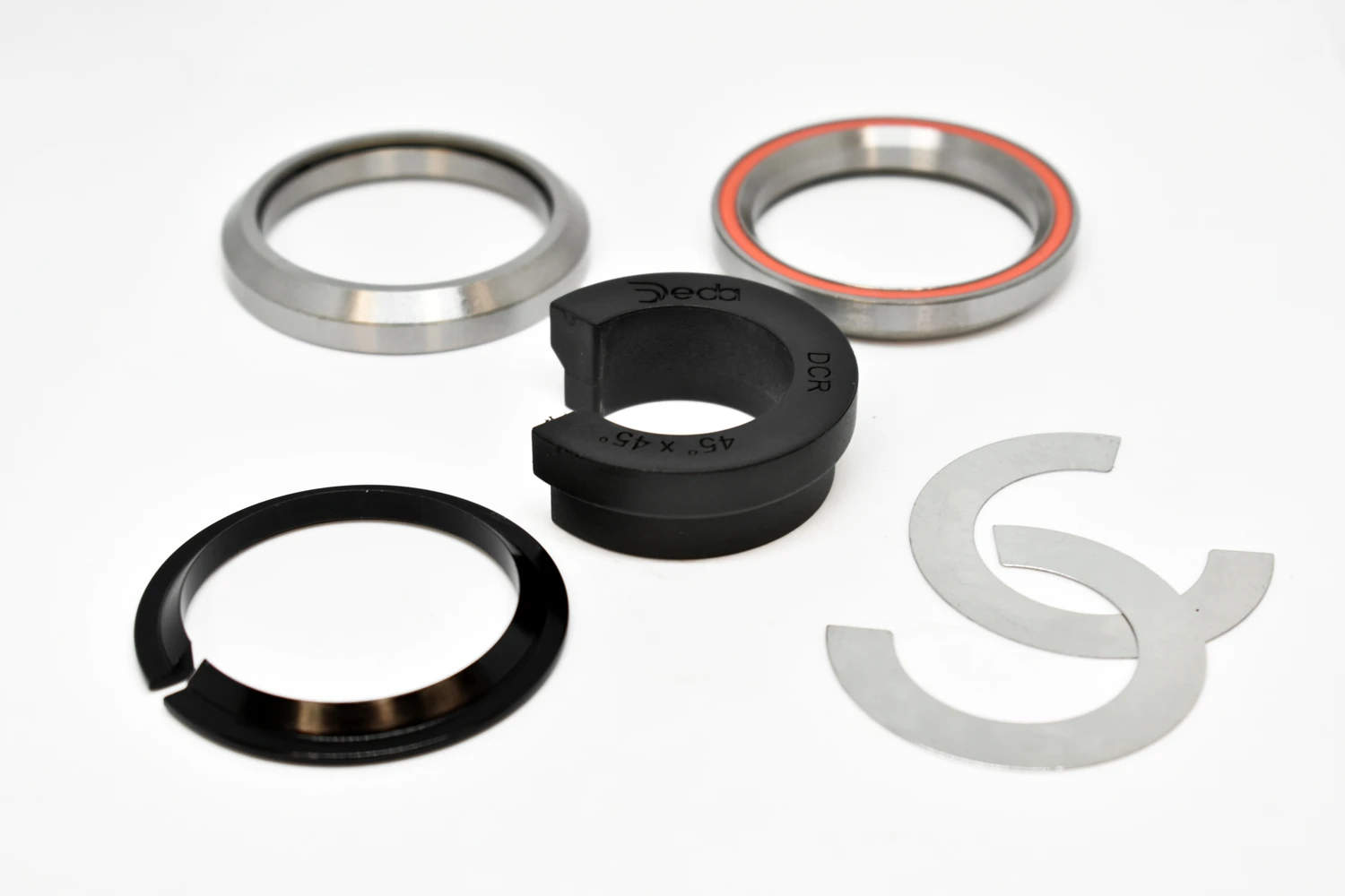 Integrated headset for DCR (Deda internal cable routing) system and compatible with Vinci, Alanera and Superbox stem. It allows the full integration of the cables through the headset bearing. The DCR system works with a standard tapered fork steerer (1-1/8” – 1.5”), but requires a 52mm (1.5”) upper headset bearing od. The special compression ring design leaves room for the cables to fit the gap in between the headset bearing and the fork. The DCR topcover for Alanera & Superbox (cod. HDALADCRTC56) and Vinci (HDVCNTC56) is not included in the kit, but available to purchase separately.